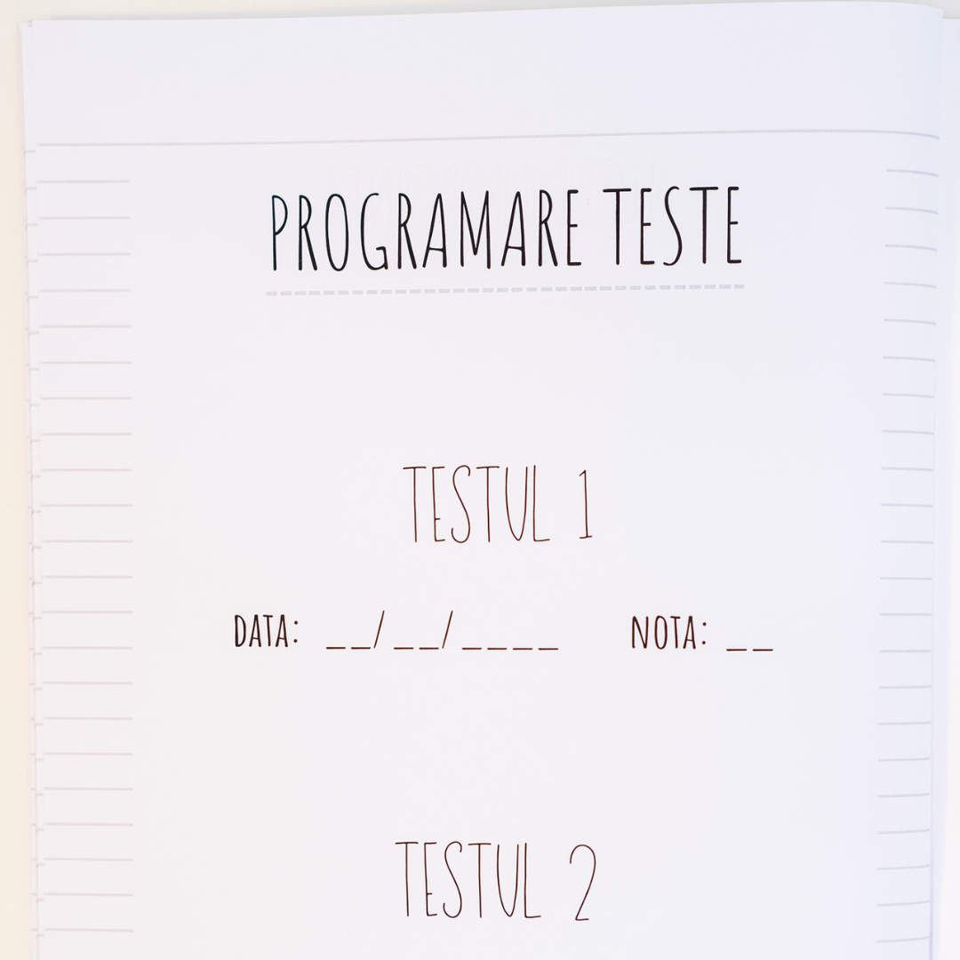 🗓️ Programarea testelor: la finalul caietului ai o pagină specială unde poți nota datele testelor și notele, pentru a vedea cât ai evoluat la această materie.