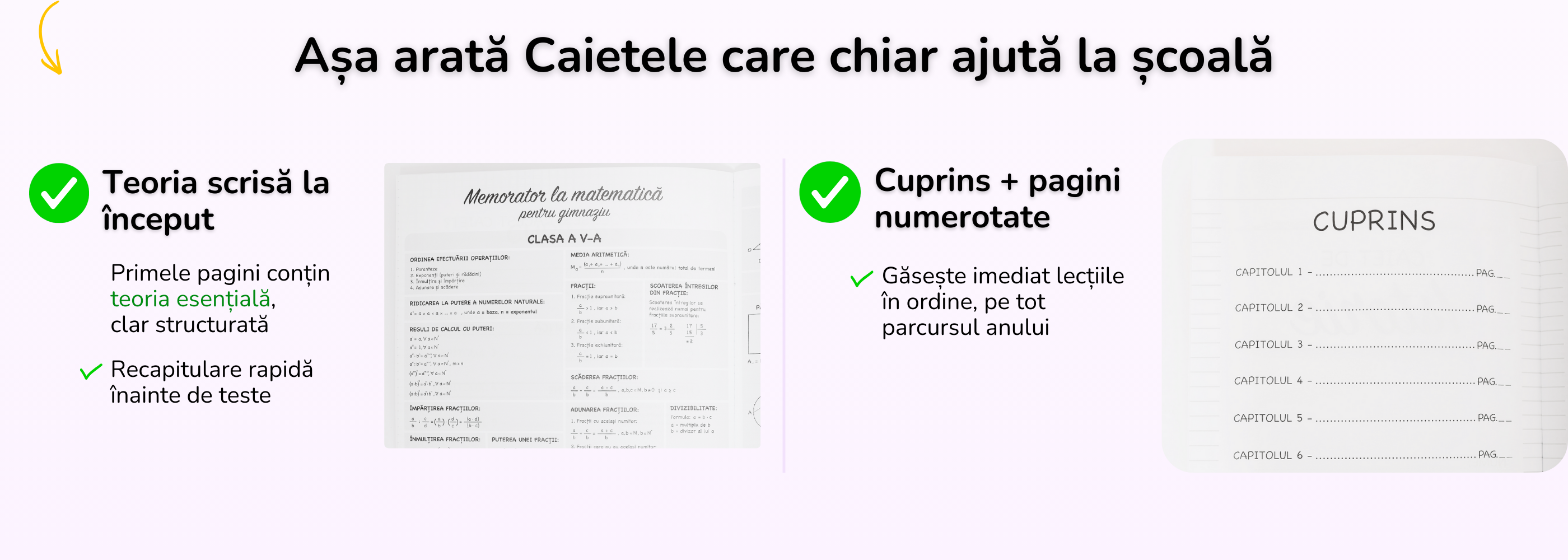 Conținutul este deja structurat, cu teorie clară și organizare logică, astfel încât copilul să nu mai piardă timp copiind sau căutând informații.