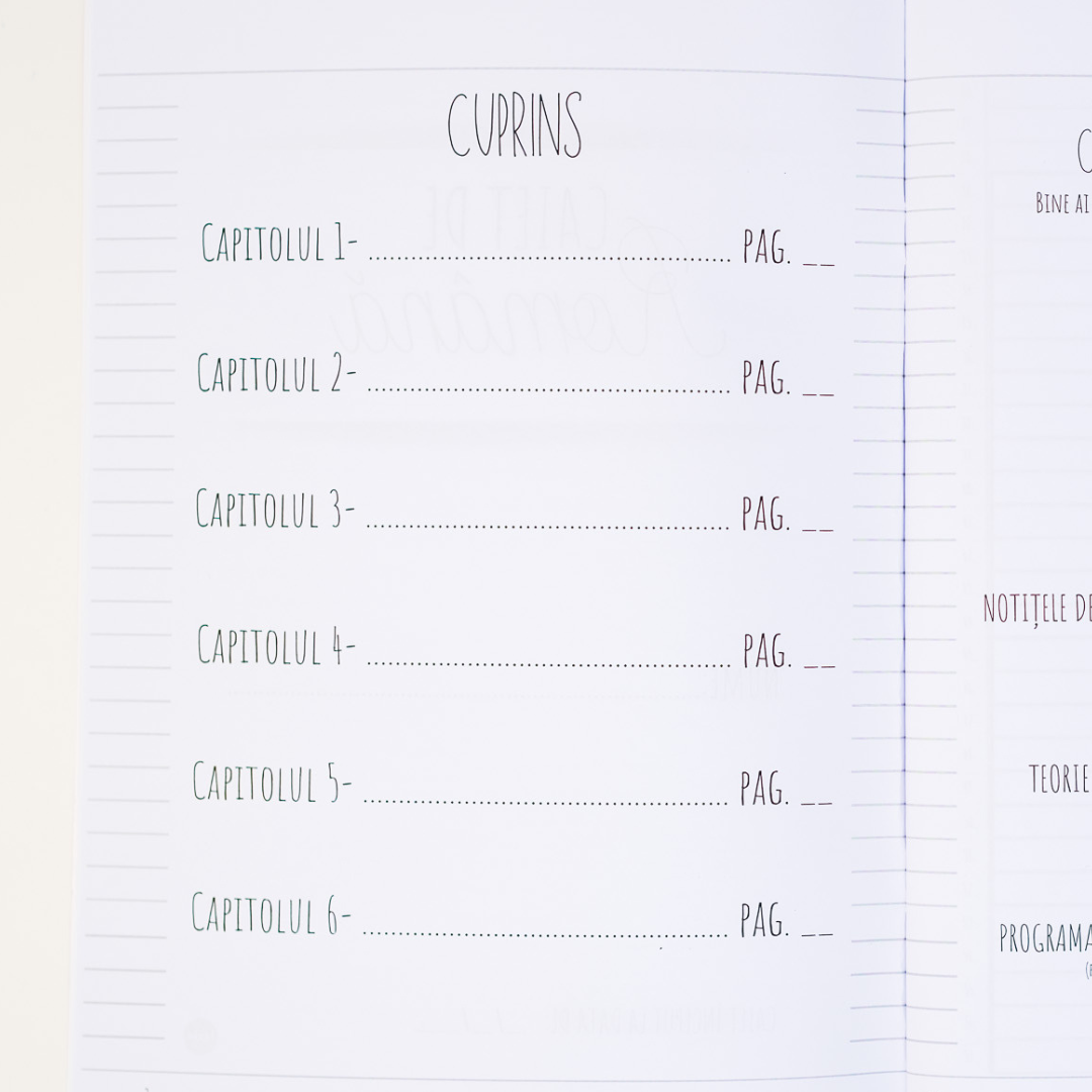 📑 Cuprins și pagini numerotate: la începutul caietului vei găsi un cuprins complet, unde poți nota titlul lecției și pagina corespunzătoare - ca să fii mereu organizat(ă) și să găsești rapid tot ce ai nevoie!